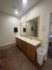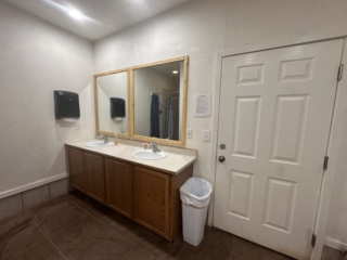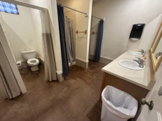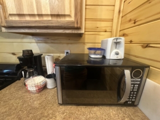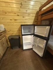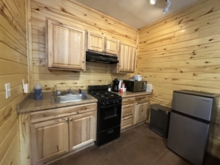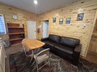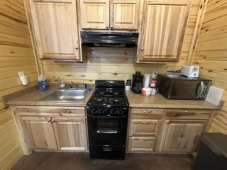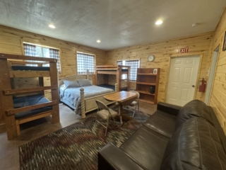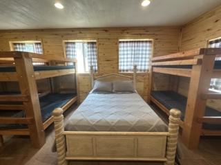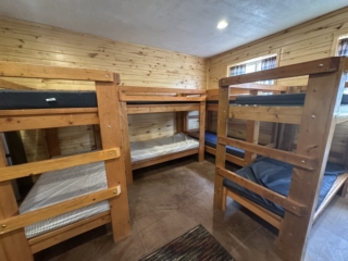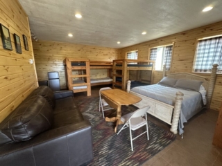Cabin Truth has 5, two-person bunk beds and a large queen bed. It also has connected bathroom with 2 toilets, 2 sinks, and 2 showers. The main cabin space is equipped with a kitchenette complete with sink, counters, cabinets, a couch, table seating, and a gas oven/range. This cabin also has heated floors to keep you cozy in the wintertime!